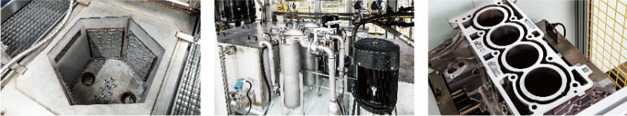 機器人抓取工件至浪涌池,對工件表面進行低壓噴淋清洗及浪涌清洗,能快速剝離工件內殘留較大金屬顆粒,清洗完成后打開電磁閥快速排出液體及循環過濾。